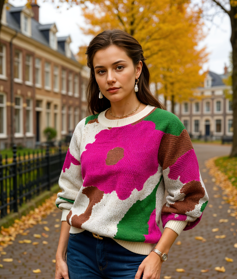 Deze gebreide jumper voor dames met een opvallend patroon brengt een levendige en unieke uitstraling naar je dagelijkse outfits. Met een ronde halslijn en volumineuze ballonmouwen, biedt deze trui zowel comfort als een modieuze flair. Perfect te combineren met jeans, rokken of op maat gemaakte broeken, voegt deze trui een speelse persoonlijkheid toe aan zowel casual als smart-casual ensembles.